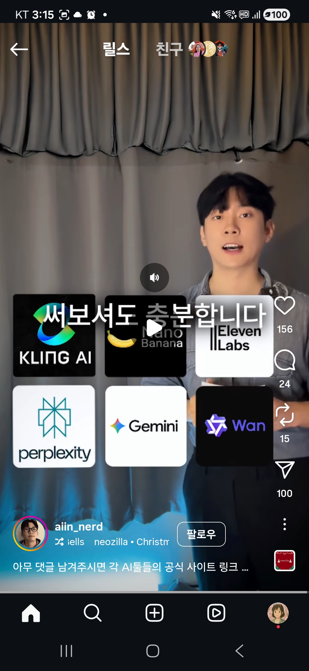 사진 속 콘텐츠는 인스타그램 계정 @aiin_nerd에서 소개한 릴스 장면이에요. 다양한 AI 툴들이 화면에 등장하며, "댓글만 남기면 공식 사이트 링크를 알려준다"는 메시지가 함께 나옵니다. 이건 단순한 광고가 아니라, 실제로 유용한 툴들을 소개하는 콘텐츠예요.
