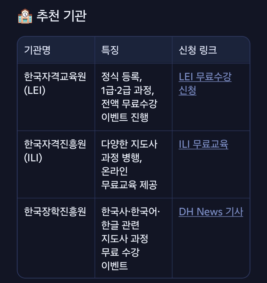 - 자격증 과정: 1급, 2급 과정이 있으며 일부 기관에서 무료 수강 기회 제공.